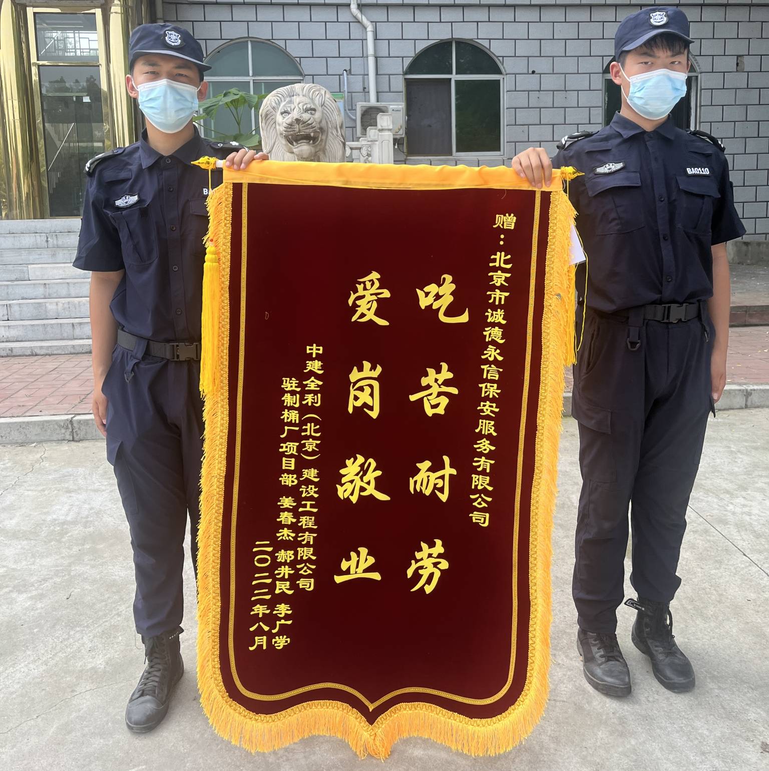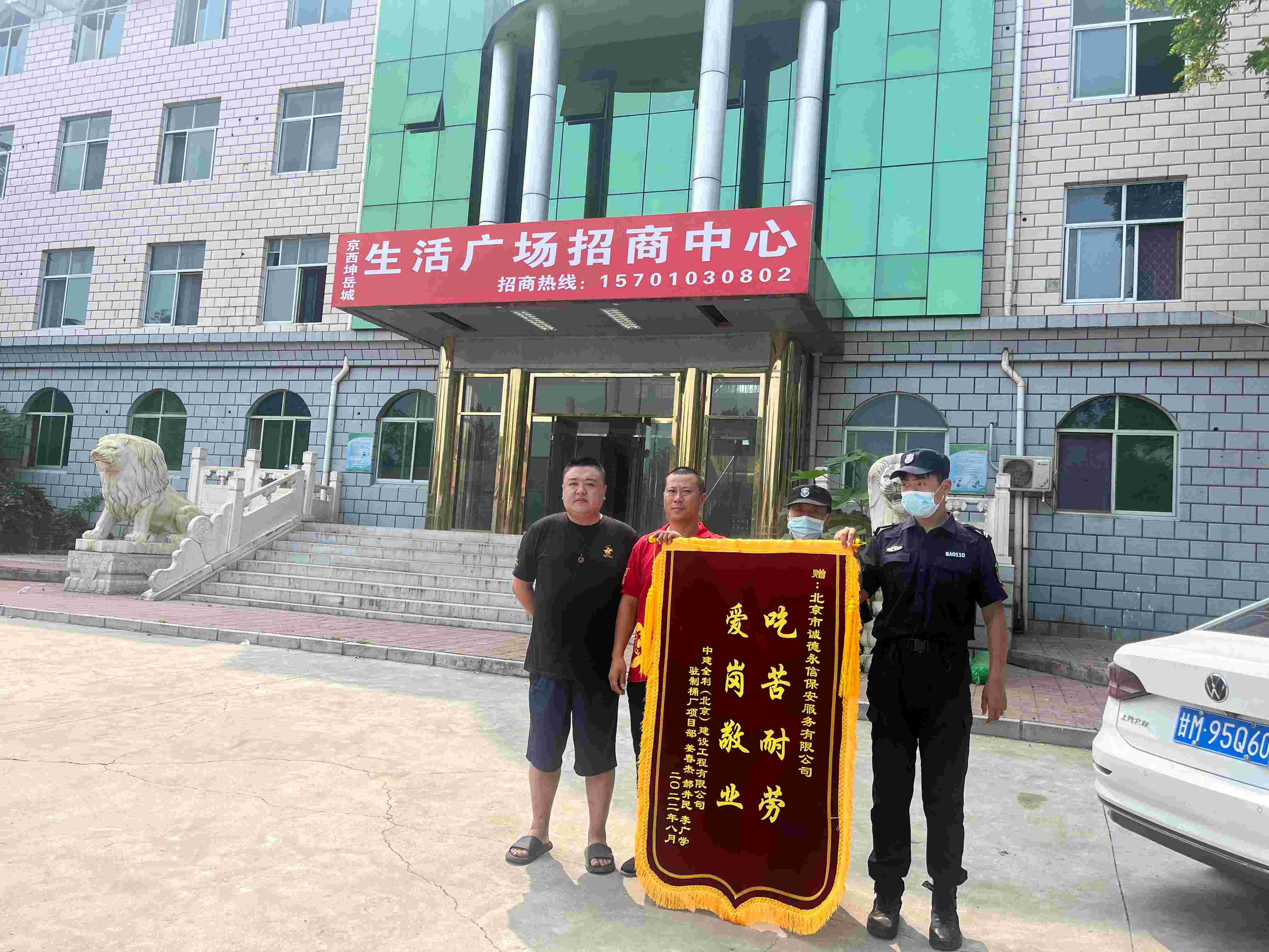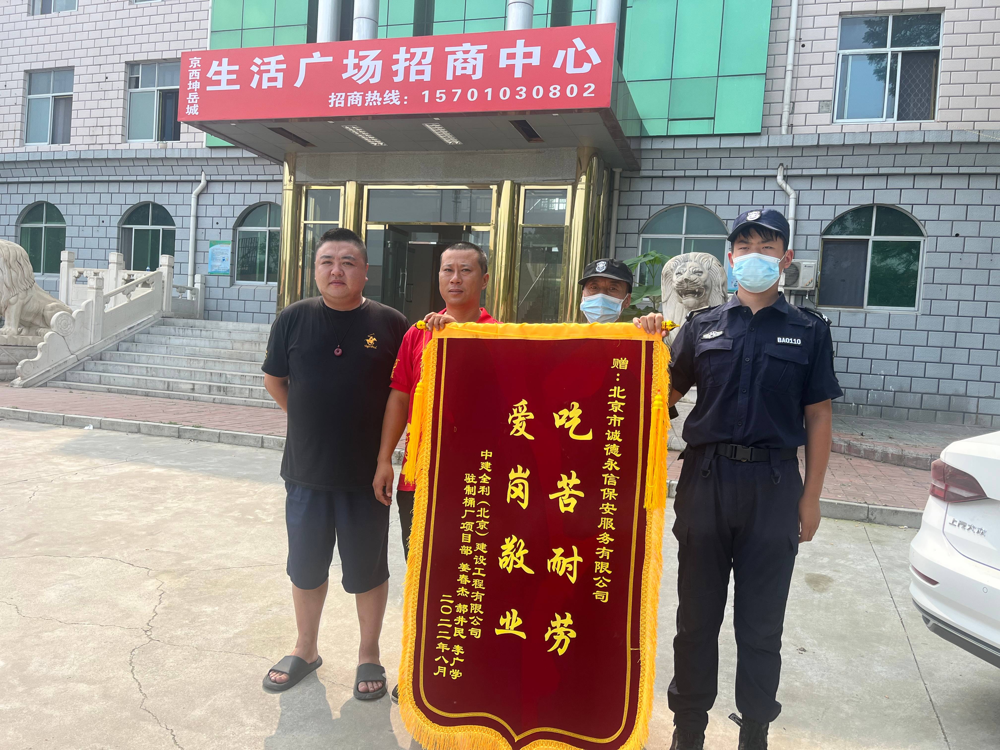 2022年8月1日,中建全利招商办公处驻制桶厂项目部由姜春杰等人为代表,将一面绣有“吃苦耐劳,爱岗敬业”的锦旗送到北京市乐鱼平台保安服务有限公司项目负责人的手中,对我司保安队的优异工作表现表示诚挚的感谢。